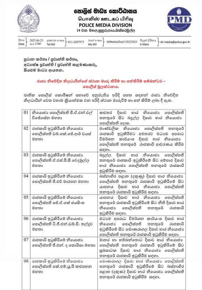 නියෝජ්ය පොලිස්පතිරුන් ජ්යෙෂ්ට පොලිස් අධිකාරීවරුන්ට අමතරව පොලිස් අධිකාරීවරුන් දෙදෙනෙකුට සහ සහකාර පොලිස් අධිකාරීවරුන් පස් දෙනෙකුට ද ස්ථාන මාරුවීම් ලබා ඇති පොලිස් මාධ්ය කොට්ඨාසය සඳහන් කළේය.