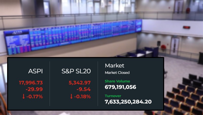මේ අතර ඊයේ (30) දිනයේ දී ඉතිහාසයේ පළමු වතාවට ඒකක 18,000 සීමාව ඉක්මවා ගිය සියලු කොටස් මිල දර්ශක අගය අද දිනයේ දී එම සීමාවෙන් මෙපිටට ඇවිත්, දිනයේ ගනුදෙනු අවසානයේ දී ඒකක 17,996.73 ක් ලෙසින් සටහන් විය. එහිදී ඒකක 29.99 ක පහළ යාමක් සියලු කොටස් මිල දර්ශකයෙන් වාර්තා වී තිබේ. S&P SL20දර්ශකය ඒකක 9.54කින් පහළ ගොස් දිනය අවසානයේ දී ඒකක 5,342.97 ක් ලෙසින් සටහන්ව ඇත.
