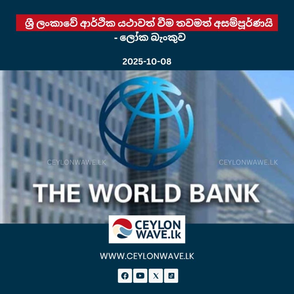 අද (07) නිකුත් කරන ලද ශ්රී ලංකා සංවර්ධන යාවත්කාලීන කිරීම් නවතම වාර්තාවට අනුව 2025 දී ශ්රී ලංකා ආර්ථිකයේ 4.6%ක වර්ධනයක් වනු ඇතැයි ලෝක බැංකුව පුරෝකථනය කර සිටී.